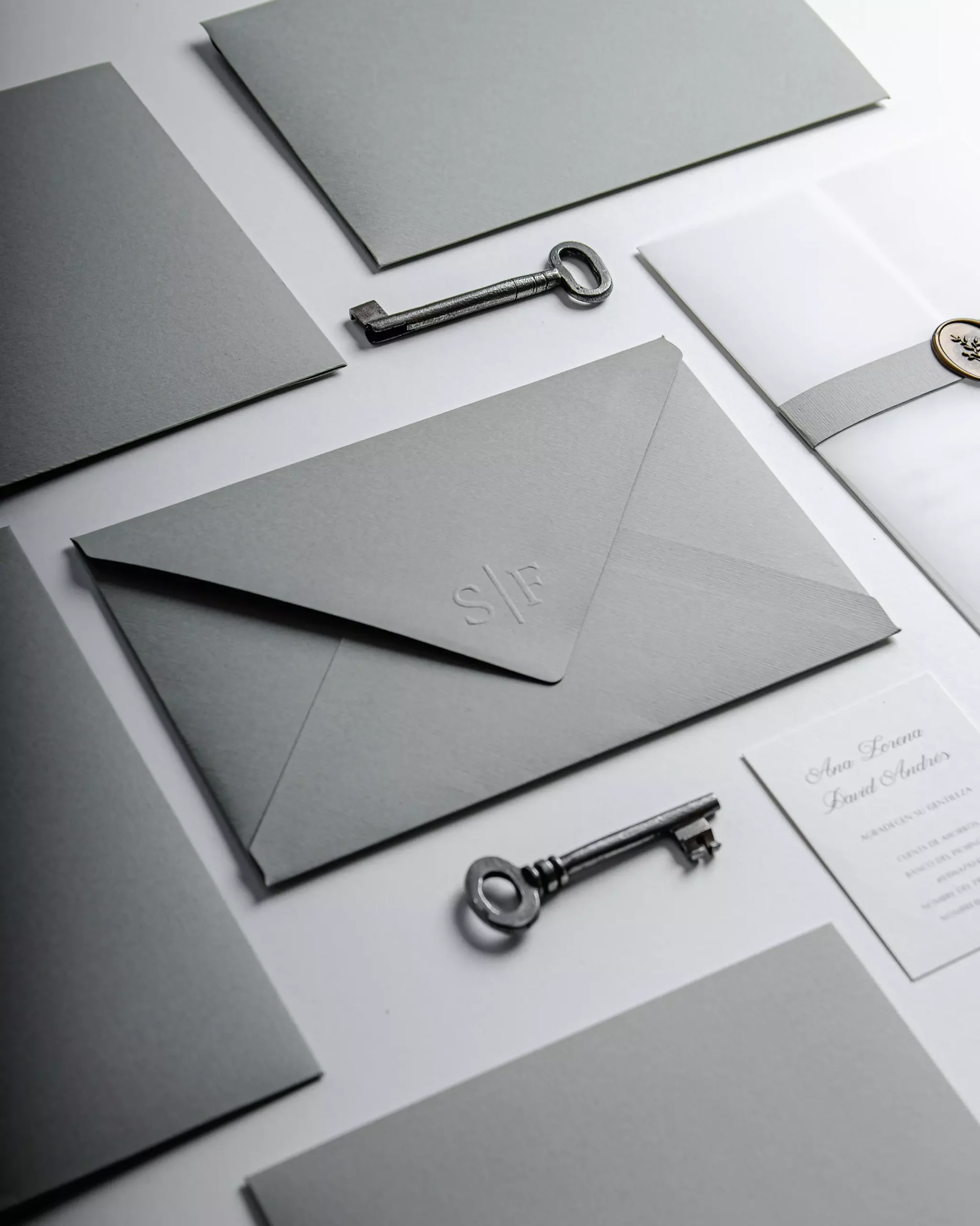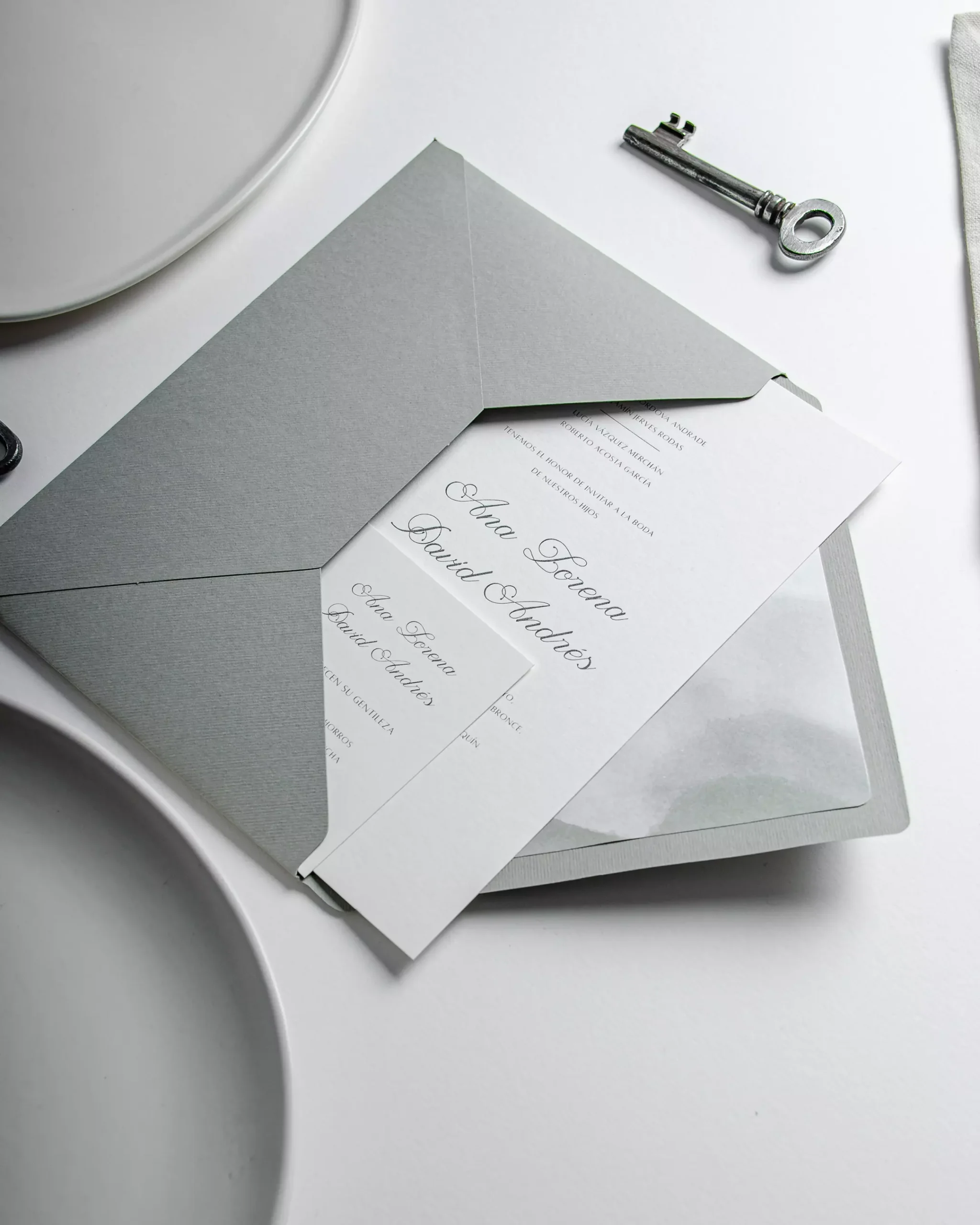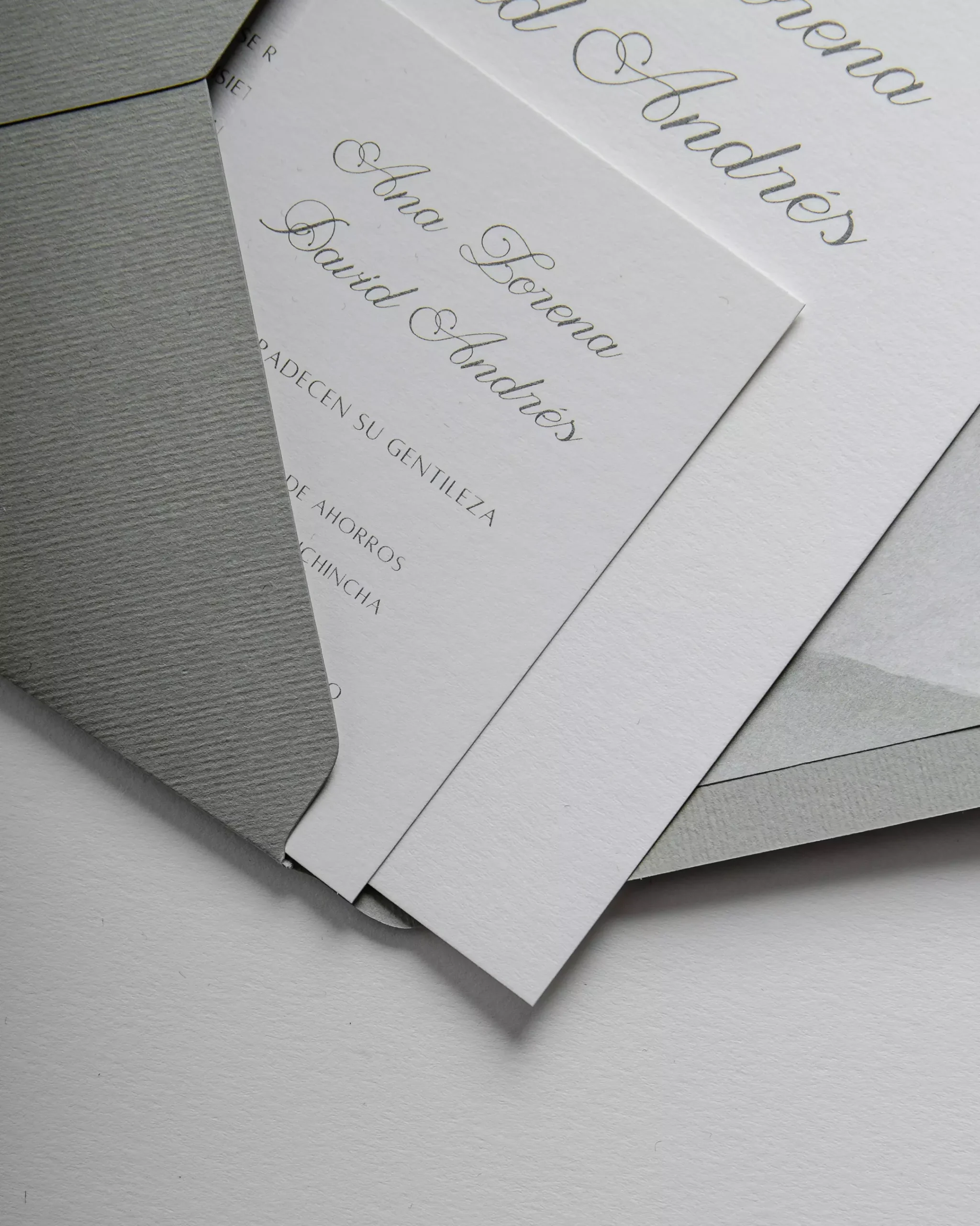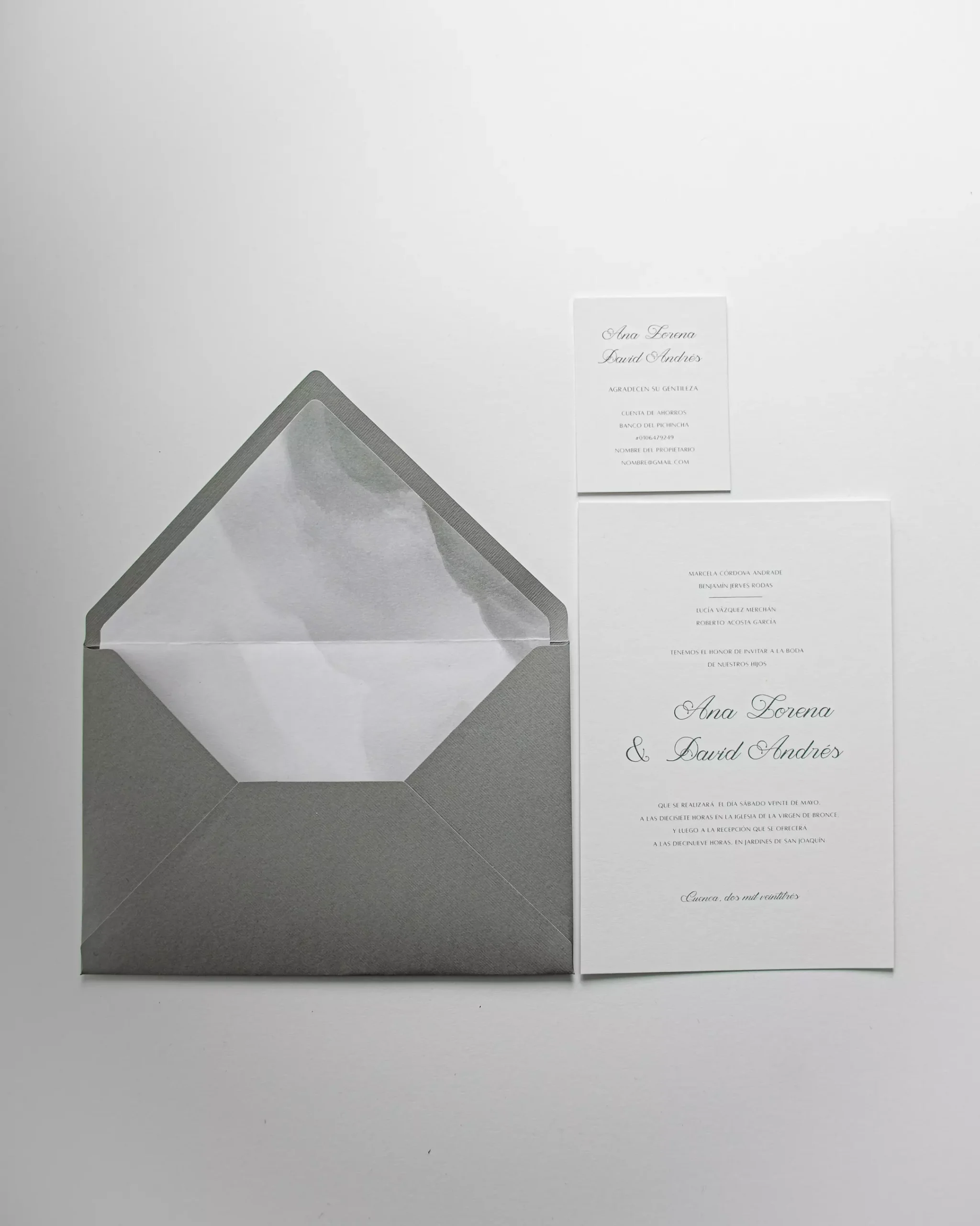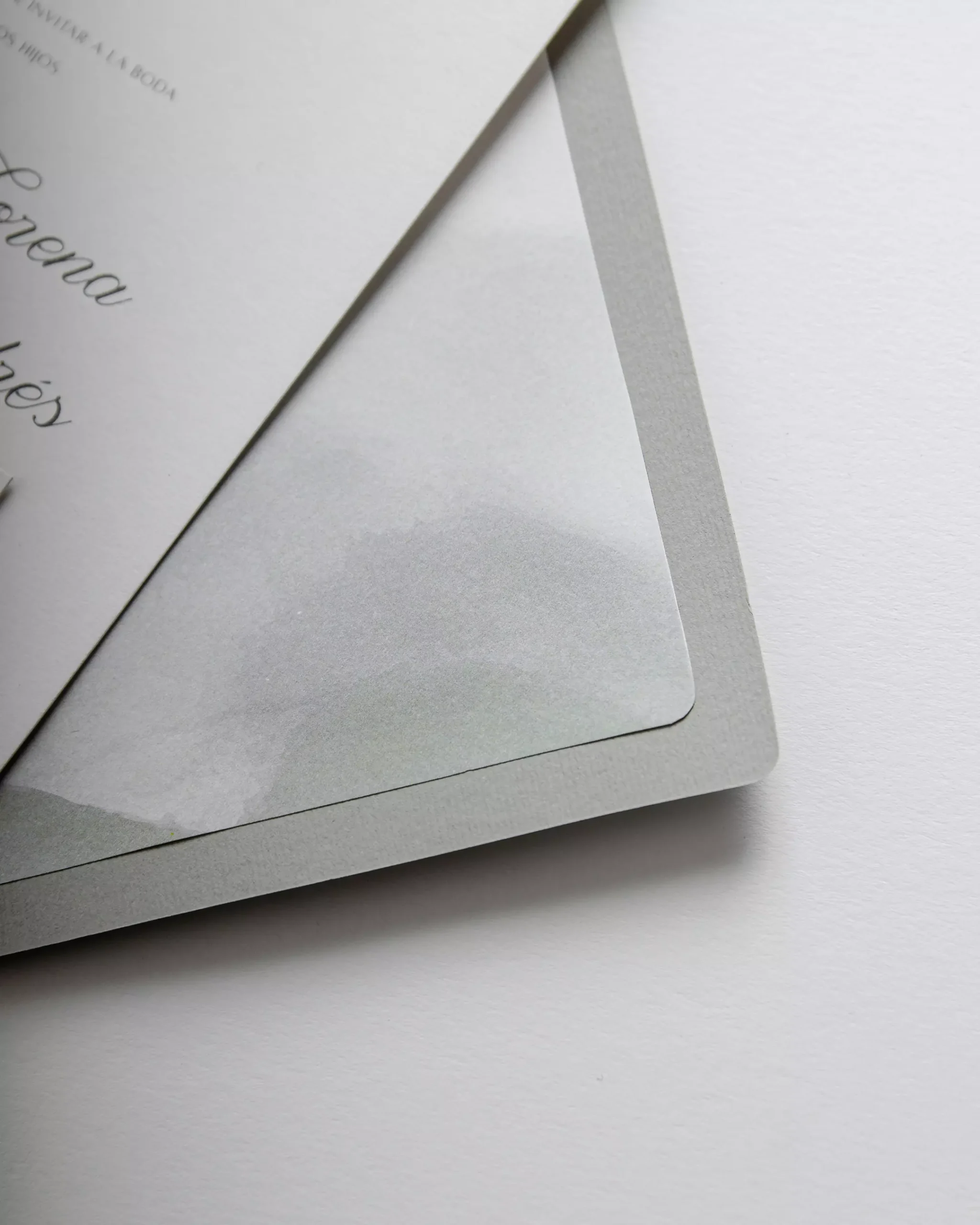 Invitación versión estándar, igualmente hermosa y elegante, en paleta de color sage green y blanco crudo, el forro agrega un toque de originalidad a tu papelería de bodas.