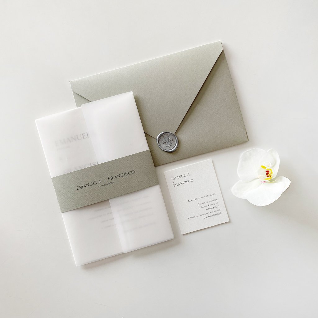Las invitaciones de boda Bloom Sage Green, es una de las propuestas más solicitadas dentro de Hola Color. Su diseño elegante, sobrio y minimalista lo convierten en el candidato perfecto para bodas de lujo. Recuerda que puedes personalizar tus invitaciones de boda con un sello de lacre, también conocido como sello de cera, que combine con tu invitación.