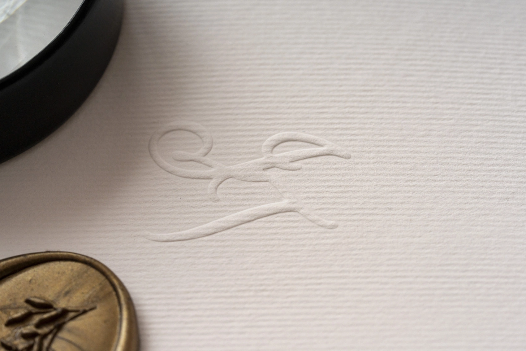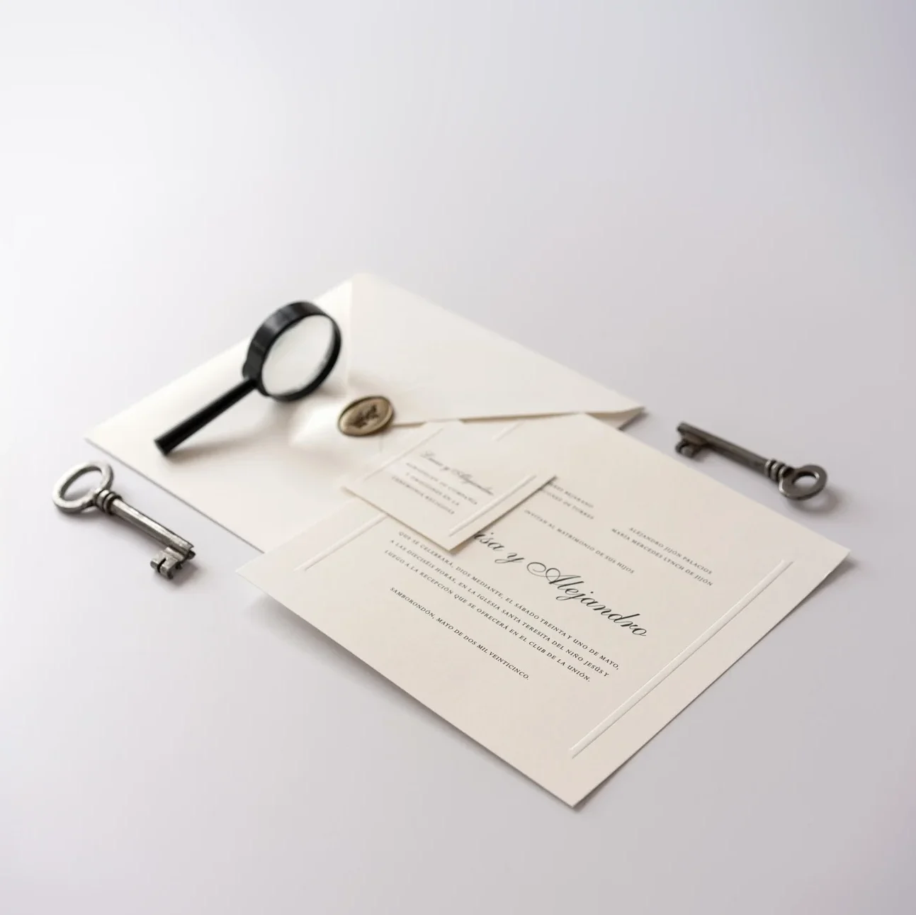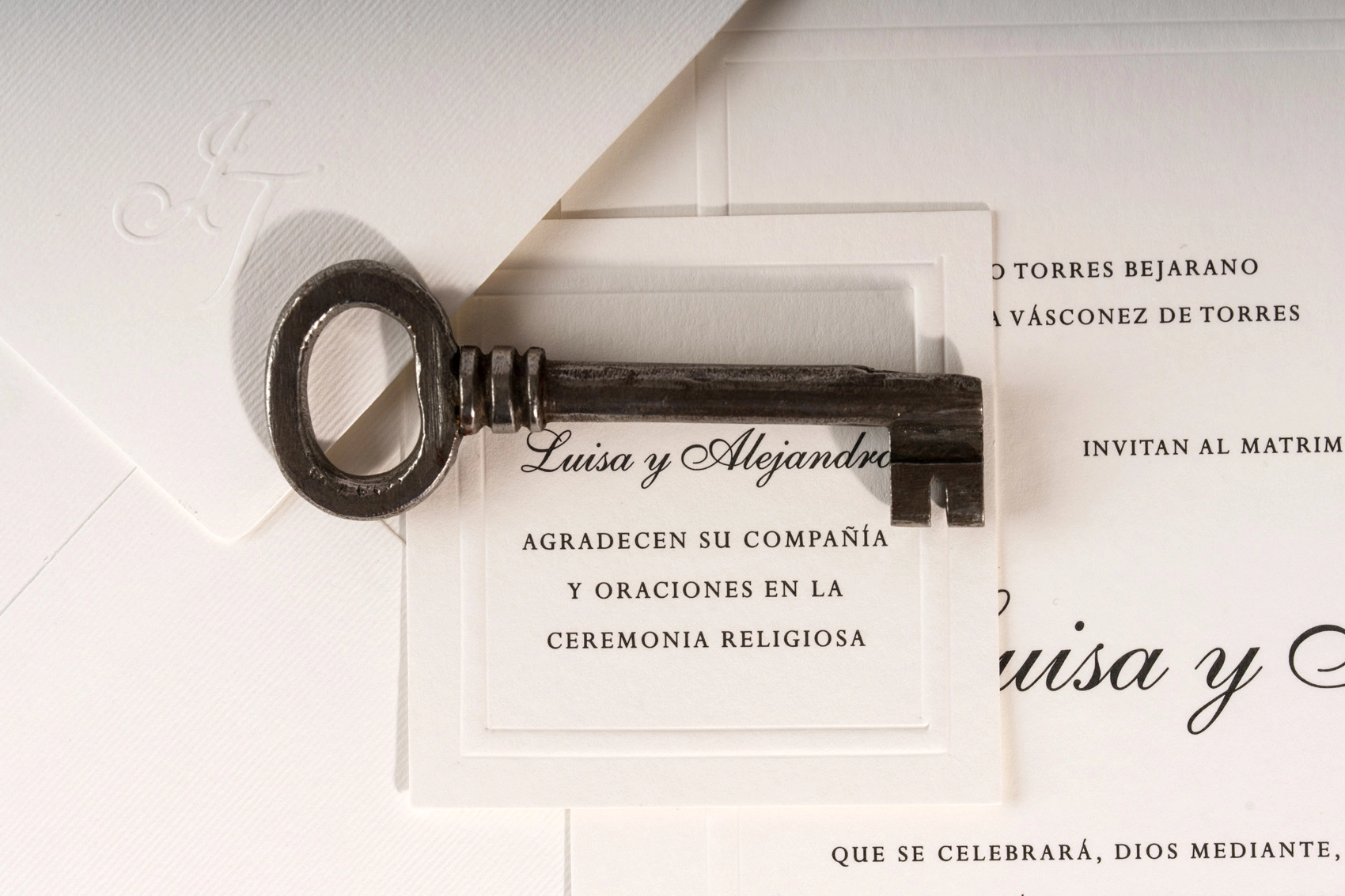 – Sobre cuadrado con monograma en relieve en solapa de sobre / 20.5×20.5 cm- Tarjeta de invitación con marco seco bold en relieve / 19.5×19.5 cm- Tarjeta de agradecimiento con marco seco bold en relieve / 8×8 cm