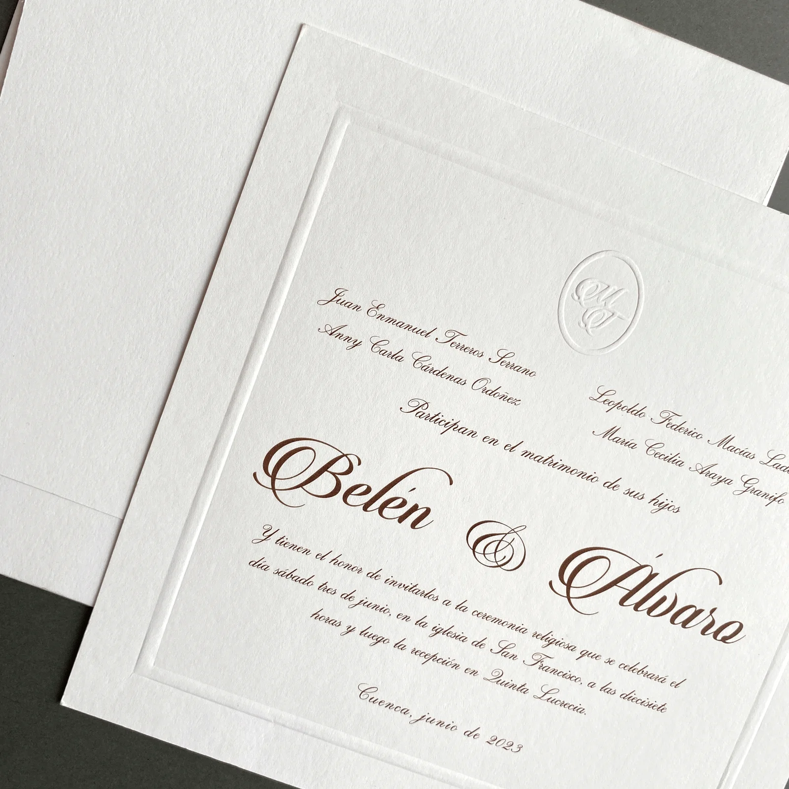 – Sobre Premium solapa larga 20×19,5cm- Tarjeta de invitación con marco seco bold / 19 x 19,5 cm.- Tarjeta de agradecimiento con marco seco bold / 7,5×7,5cm- Monograma en relieve
