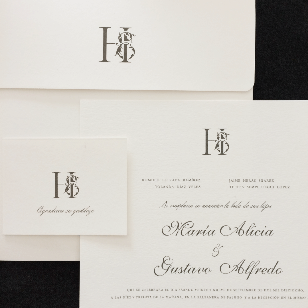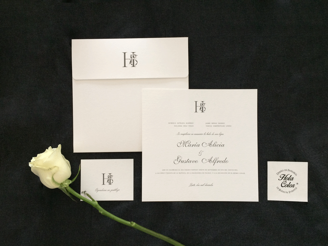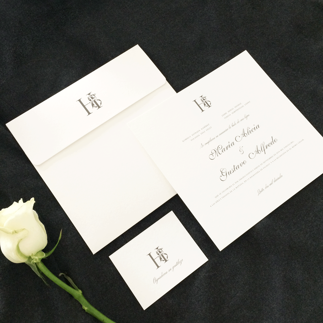 Incluye:– Sobre con monograma impreso en la solapa 20×19,5cm.- Tarjeta de invitación 19x19cm.- Tarjeta de agradecimiento 8x8cm.